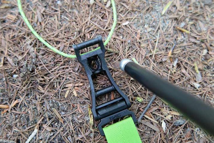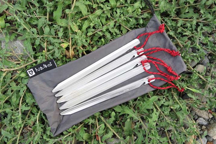 付属のペグは曲がりにくく、折れにくいジュラルミン製。指をかけて引き抜きやすいように、頭の部分には赤いコードがつけられている。ただし、本数は5本のみ。テントの四隅と前室部分という本当に最低限の部分のみにしか使えず、張り綱(ガイライン)なども含めると、あと7本も足りない。自分で足せばいいとはいえ、付属品としては少々不親切といわざるを得ない