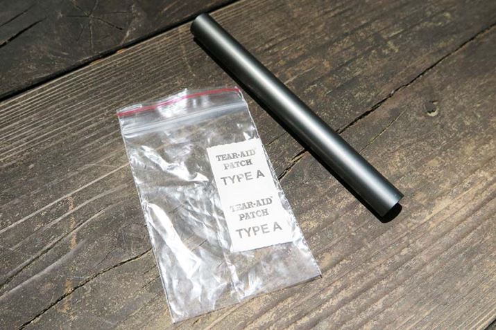 山中での破損に備え、リペア用の付属品も。左はインナーテントやフライシートが破れた時に貼り付ける粘着性シートで、右はポールが折れた時に使う金属スリーブである