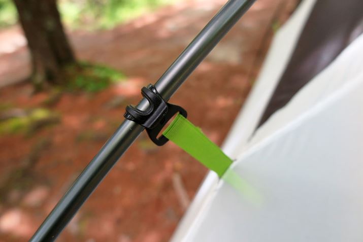 そのうえ、タニ 2Pには設営しやすいようにいくつかの工夫がなされている。インナーテントとポールの組み合わせは「吊り下げ式」。インナーテントに取り付けられているフックをポールにかけるタイプである。以前の主流は、インナーテント外側に付けられた細長い袋状部分にポールを差し込む「スリーブ式」だったが、吊り下げ式のほうが直感的に設営でき、初心者にも使いやすい。ポールの末端もインナーテントのパーツに1度ハメたら簡単には外れない形状となっており、ストレスなく設営することができる。