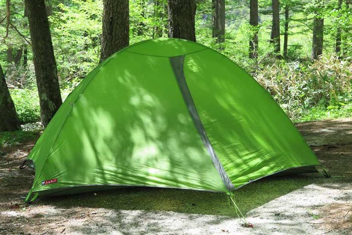 今回紹介するタニ 2Pは、「自立型&ダブルウォール」のテントである。日本の山のテント場には地面が岩や小石で覆われている場所も多く、ペグ打ちしなければ立体化しない非自立型は少々使いにくい。また、高温多湿な日本の夏は雨が多いため、雨除けのひさしとなるフライシートがあるほうが浸水に強く、インナーテントとの間にできる「前室」というスペースにブーツなどを置くこともでき、使い勝手がいい。そういう意味で、「自立型&ダブルウォール」は日本の山にもっとも適した構造なのである。