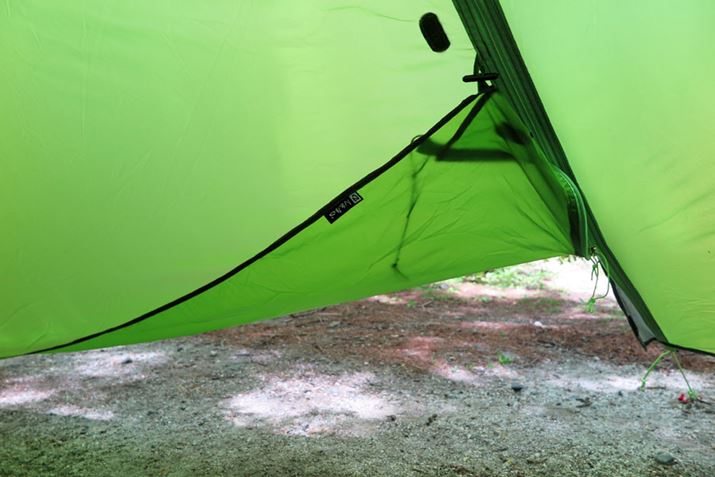 地面よりも短くなった部分をテント内部から見た様子。ファスナー近くにある小さなループにフライシート末端のトグルをかけると、地面との隙間が広がるのだ。これにより、テント内部への直射日光を防ぎつつ、通気性の向上が見込まれる
