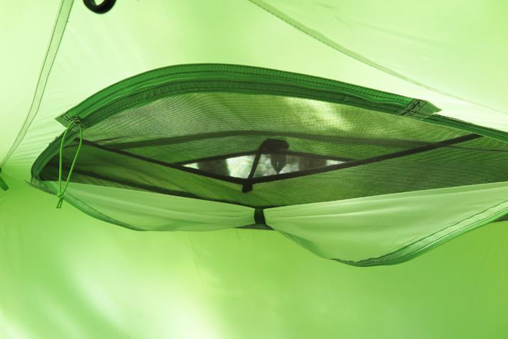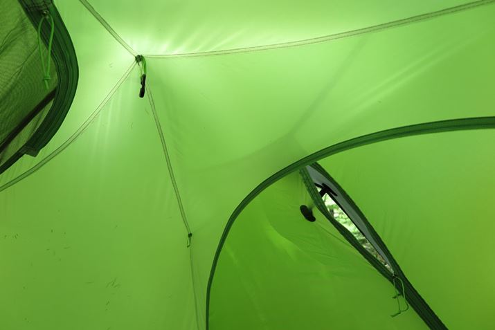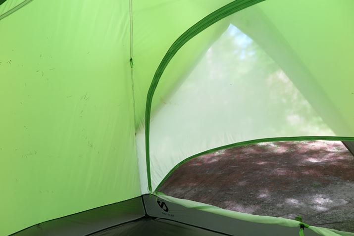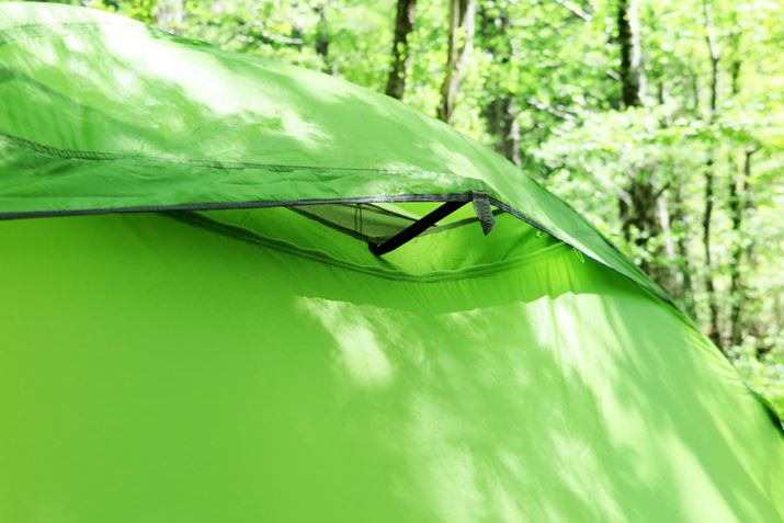 外からの光でインナーテントの色までグリーンになってしまっていてわかりにくいが、右下の部分のみテント内部から見たフライシート。フライシートのファスナーはダブルタイプで、上部だけ開き、バー状のパーツで強制的に開くことで換気をうながせる