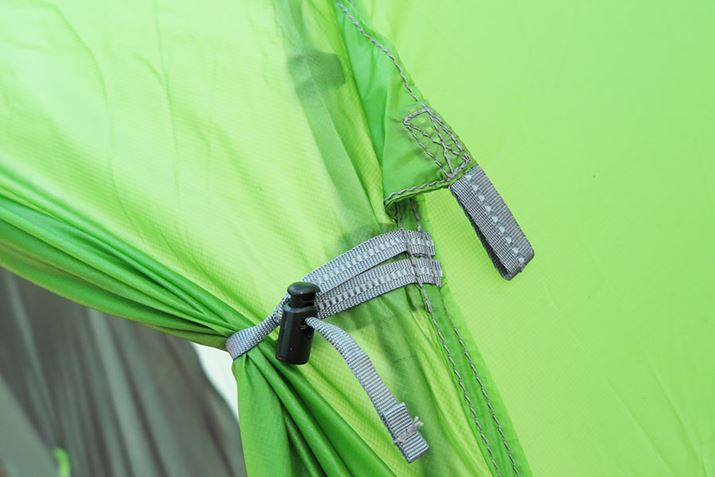 フライシートを巻き上げて留めるためのトグルと平たいテープ。従来はこのテープが接着剤で貼り付けられていたため、経年劣化ではがれ、フライシートを留められなくなるという問題が多発していた。だが、最新モデルは縫製で固定。もう剥がれ落ちる心配はない