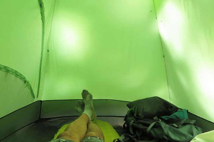 通気性、換気性を増したタニ 2Pは、従来モデルよりも快適である。今回のテストでは、テント内部の温度が上昇しないように陽が当りにくい場所にテントを設営したが、それでも日中はかなり蒸し暑かった。だが、ベンチレーターの新しい工夫もあってか、ひとたび風が吹けば涼しい空気がテント内に流れ込むのがよくわかる。テントの重量を1s少々に抑えながら、ここまでベンチレーターの機能を向上させるとは、感心させられた。