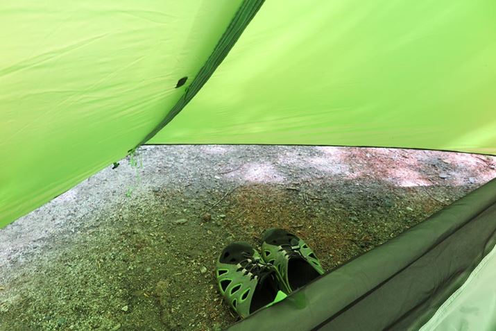 前室の広さも十分。サンダルとブーツの2足、さらにはクッカーやボトルなどを置いても余裕がある。この状態からさらにフライシートが地面に近付くようにペグを打つと、ますます雨から道具類が守られる