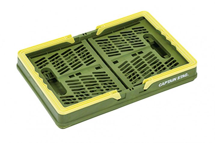 「取っ手付FDコンテナ<L>」は、道具をまとめて収納できる取っ手付きのコンテナ。使わないときには折りたたんでおくことができます。キャンプの道具は、食器や調理器具、カセットガスなど、細々とした小物が大量にあります。バッグなどに入れておいてもいいのですが、すると中身がわかりにくいですし、出し入れも面倒……。