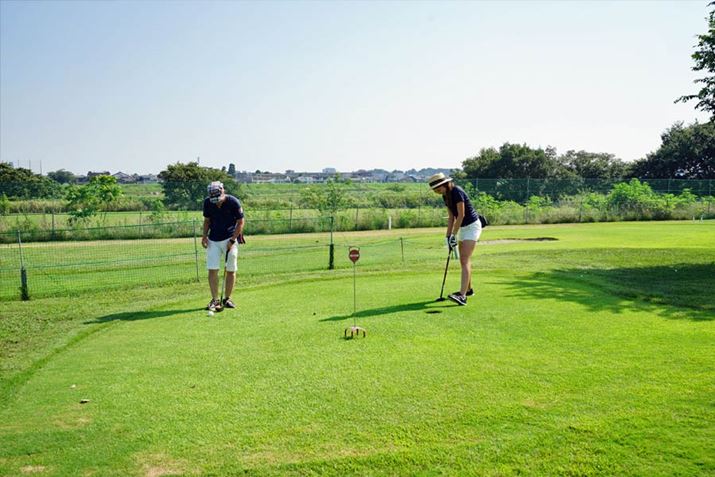 └ゴルフボールより大きいボールを1本のクラブで打って少ない打数でのカップインを目指します。ルールはゴルフと微妙に異なるところもあります。また、コースにドレスコードはないのでカジュアルなファッションでOK。靴底に鋲(びょう)の付いたものは不要、スニーカーで十分です。