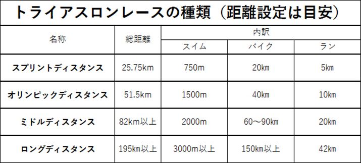 基本的なトライアスロンのレースの距離設定。ちなみに、「ロングディスタンス」より長い「アイアンマンレース」は、スイム3800m、バイク180q、ラン42qの総距離約225km!