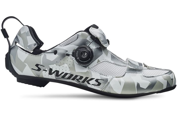 ちなみに、こちらがトライアスロン専用シューズの上位モデルであるスペシャライズドの「S-Works Trivent Triathlon Shoes」。ダイヤルを回すとワイヤーが靴を締め付ける「Boa L4クロージャシステム」を搭載しており、着脱を素早く行える。価格は39,960円(税込)