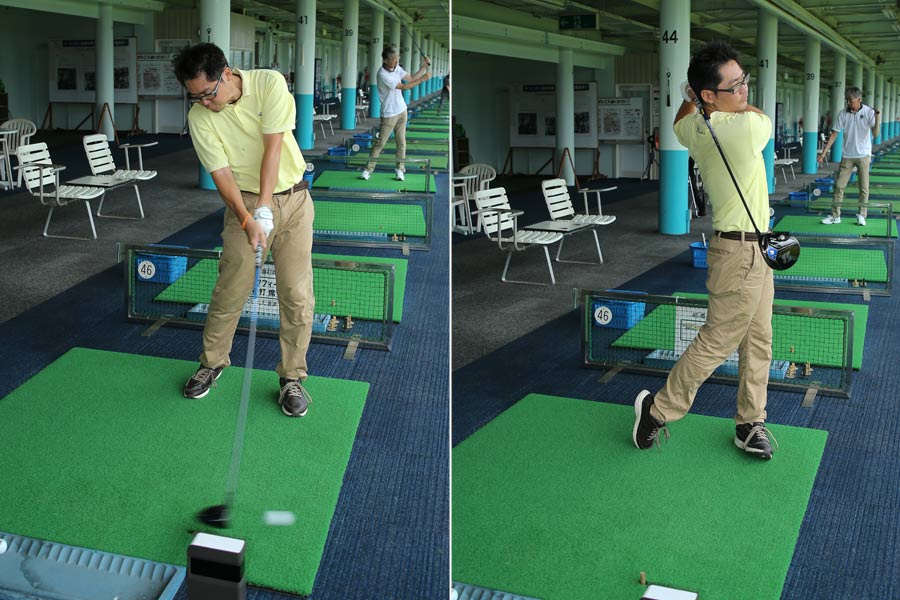 最初は、ストレートボールを狙って打ってみました。出た球は、狙った方向に程よいバックスピンを伴ったストレートボール。ヘッドの操作性は程よい感じで、狙った目標に打ち出しやすかったです。次にあえて芯を外して打ってみると、ややバックスピンが増えますが曲がりが少なく、極端なミスになりにくい。
