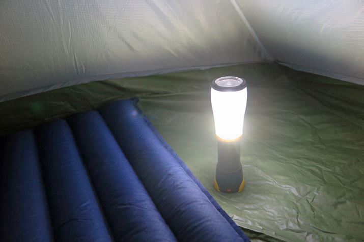 もちろん、通常のランタンのようにテーブルや床、地面に置いて使うこともできる。その際の安定感もなかなかのものだ。縦方向に長いランタンの多くは重心が高く、少しだけ触っただけで転がってしまったり、強い風で倒されたりしがちだが、ハイアックランタン+フラッシュライトは同サイズの他モデルに比べれば、あまり転倒を心配する必要がない。
