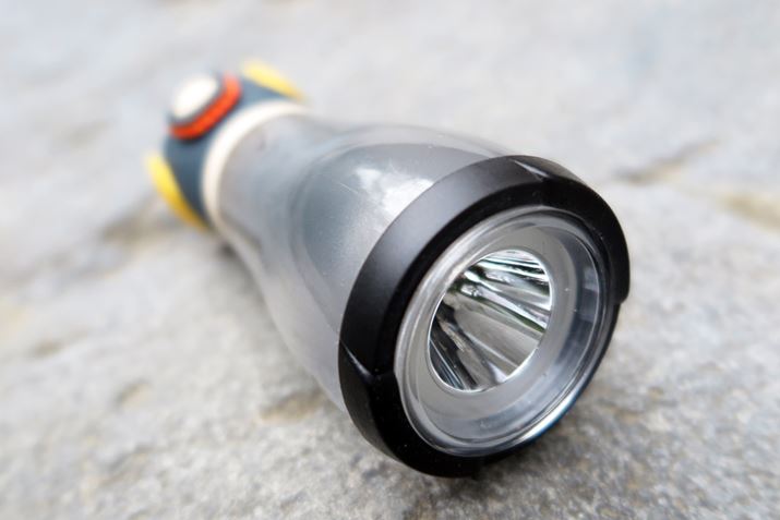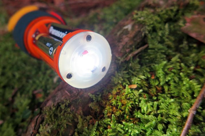 はじめに基本性能を説明しておこう。単3形アルカリ乾電池4本を使用し、高照度で7時間、中照度で50時間、低照度で115時間点灯する。また、注意をうながす時などに効果的なストロボモードにもでき、その場合の点灯時間は50時間だ。いちばん光を強くした場合でも、それほど遅くまで起きてはいないはずの登山時ならば余裕でひと晩、実際には2〜3日はもつ。中照度にすれば、数回の山行でも十分に使えるだろう。