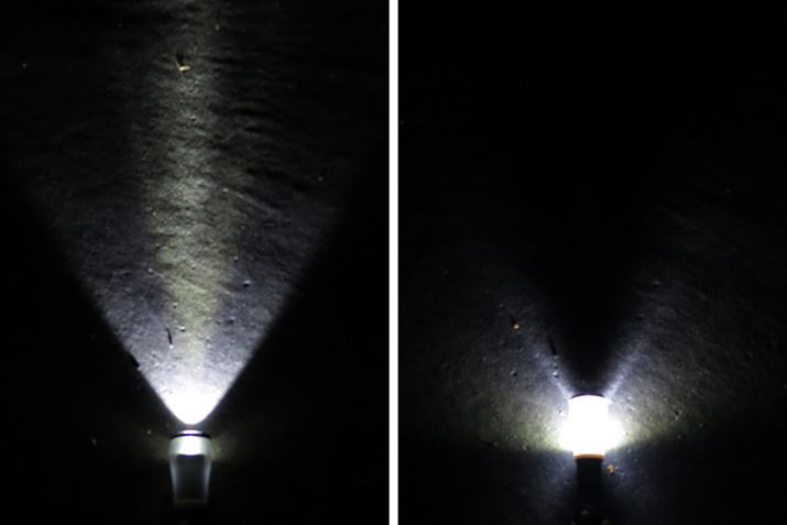 地面に横倒しにして点灯すると、光が拡散する方向がよくわかる。左は短くしたフラッシュライトとして使用する際の光り方で、光はほぼすべて前方へ向かっている。いっぽう、伸ばしてランタンとして使用する時(右)はスリガラス状のホヤの効果で、周囲に光が展開する