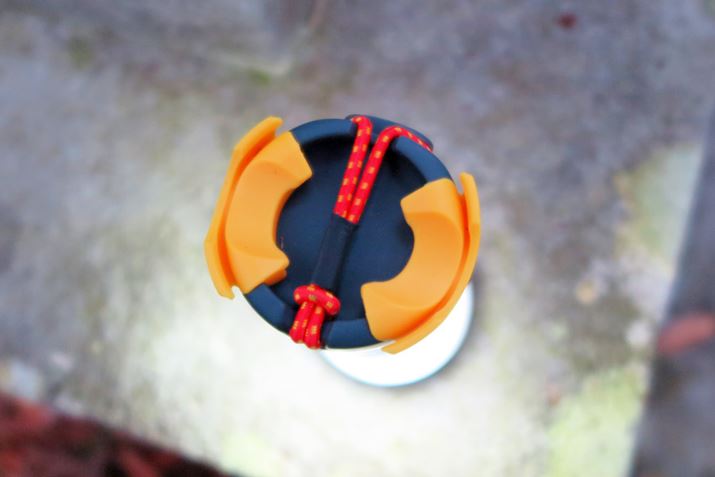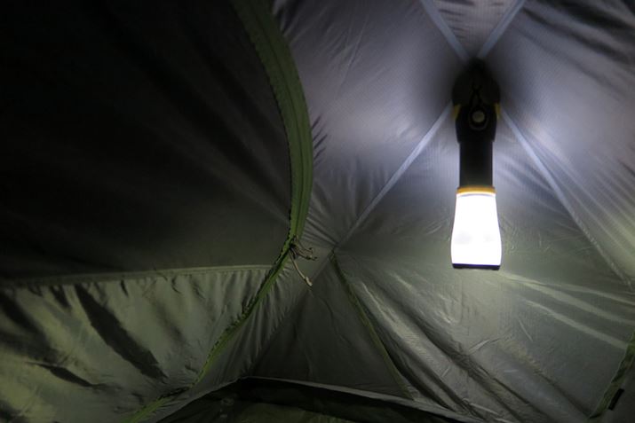 ランタンとして使う状態で垂直気味に吊してみると、円形に光が拡散していることがよくわかる。だが、この吊るし方だと真下が暗い。少し斜めに固定したほうが屋外では使いやすいだろう