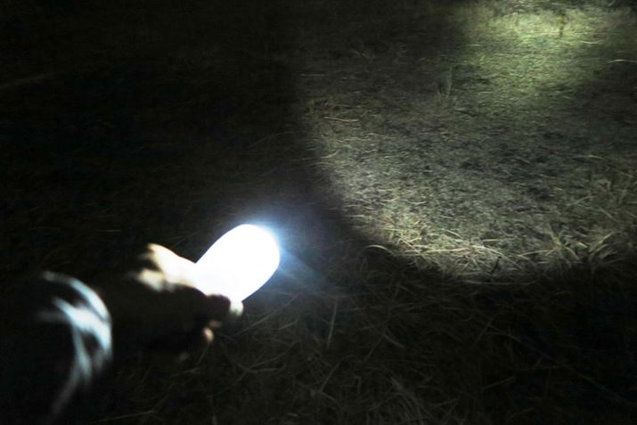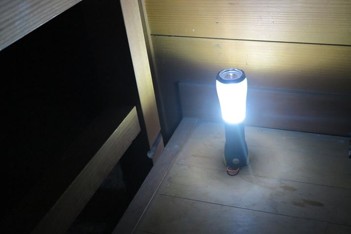 ホヤを下げ、短い状態にしてフラッシュライトとして使ってみた。ランタンとして使用する場合に暗くなってしまう方向こそ、明るく照らせる