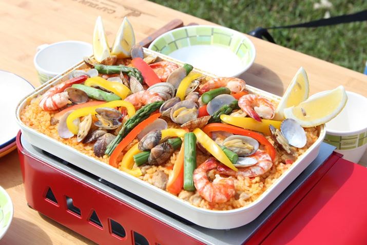 まず、「平プレート」を使ってみます。ホットプレートで作るアウトドア料理の代表といえば焼き肉ですが、ここは、かわいいプチパンに合いそうなパエリア作りにトライ!