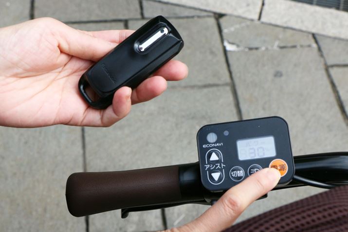 アシストモードなどを変更する操作部の電源ボタンを押すと、リアタイヤのロックが解除される(下の動画参照)。なお、スマートキー(左手に持っているもの)を、自分が着ている服のポケットやかばんに入れるなど、近くに置いておかないと解錠されない