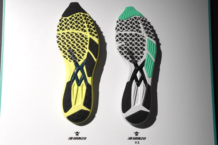 左が従来の「NB HANZO」で採用されていたアウトソールで、右が「NB HANZO V2」の最新アウトソール。「NB HANZO V2」は、三角状の「ダイナライド」を前足部に配置し、前方への推進力を向上させた。また、つま先部分の角度を調整することで、強い蹴り出しと足抜けのよさを実現している