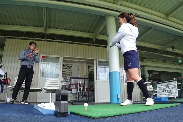 スイングの状態がどうなっているのかを説明しているところ。写真には写っていませんが、実際は現状のスイングを確認する際に弾道データを計測し、弾道データとスイング、そして実際の弾道すべてをチェックしたうえで説明するようにしています
