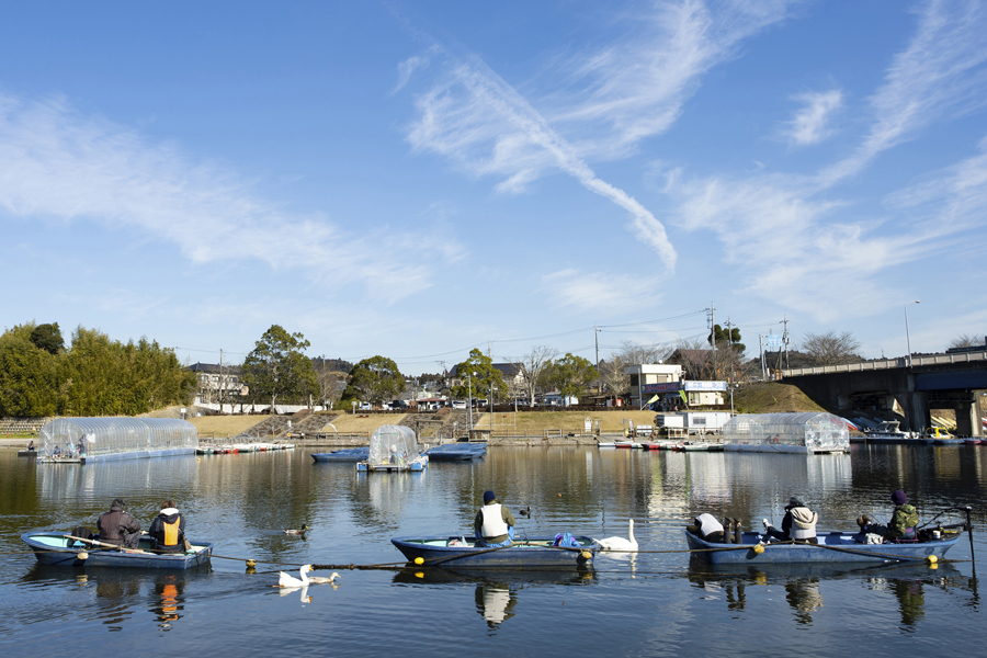 ボート釣りの様子。時期によっては、白鳥が泳いでいることも
