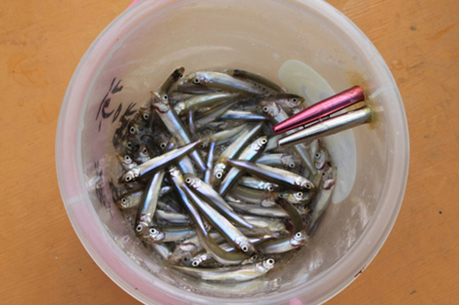 河口湖のワカサギは、サイズが8〜12cmと大きめ。引きが強く、手応えが楽しめるという