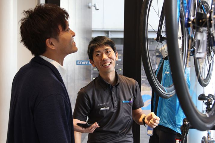 トライアスリートでもある「ジャイアントストア二子玉川」スタッフの福島康洋さん(右)にトライアスロンで使用するための最適な自転車について相談した