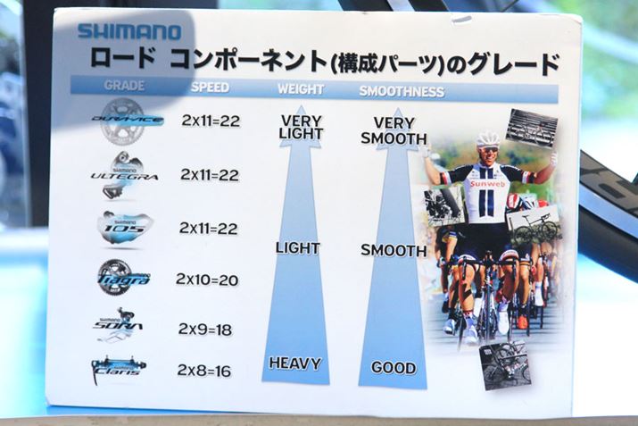 福島:問題ないと思います。ただ、図の「SPEED」の欄を見てもらいたいのですが、「デュラエース」、「アルテグラ」、「105」は「2×11」、それ以外のものは「2×10」以下になっていると思います。これはギアの段数を表しています。
