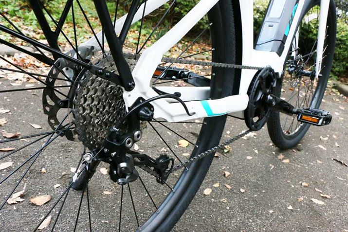 変速機構はリアのみで、9段のシマノ「ALIVIO」グレードを装備。一般的なクロスバイクに装着されるグレードのコンポーネントだ