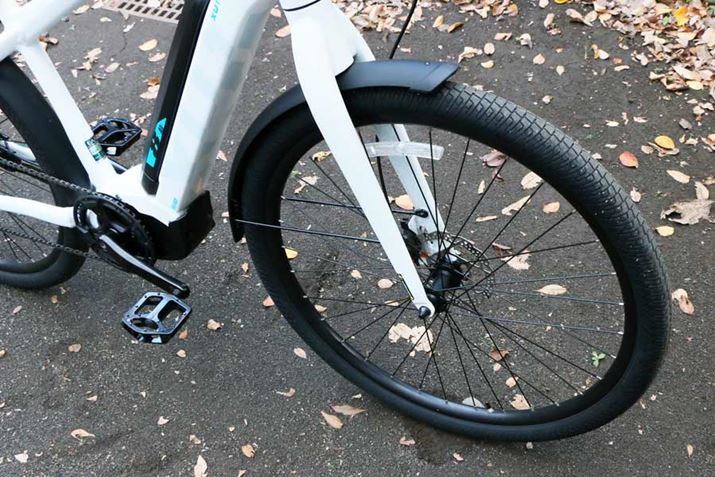 ロードバイクと同じホイール径(700C)に、50mm幅のかなり太いタイヤを履く。エアボリュームが大きいので路面の凹凸などが吸収され、乗り心地はいい。また、前後にフェンダー(泥よけ)も標準装備されている