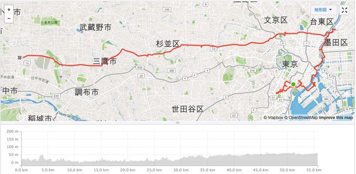 帰路の途中の様子も撮影したかったのだが、真っ暗過ぎて撮影できず。録っておいたログを証明として載せておこう。高低差はそれほど大きくないものの、途中は結構坂道もある約55kmのルートを走りきった!