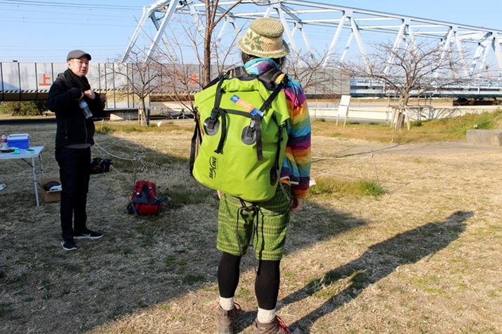 背負っているのはスーツケース並みの容量を誇る完全防水バッグ。たくさん荷物を入れても肩への負荷が軽く、荷物が少ないときはストラップのアレンジでコンパクトにもなる