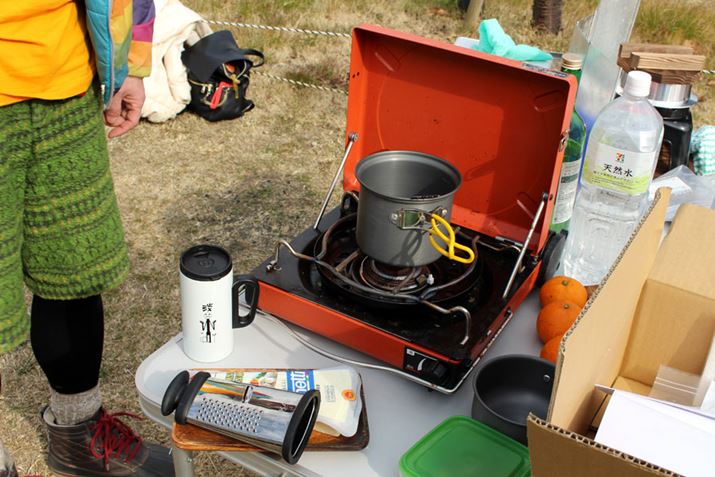 カセットコンロは風防付きのアウトドアモデル。チーズおろしは削る面積がそこそこ大きく、丈夫な釣鐘型がお気に入り