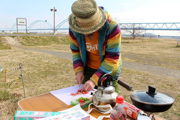 自転車旅行中の食事ということで、あえて用意されたテーブルではなく、地べたで作り始めた