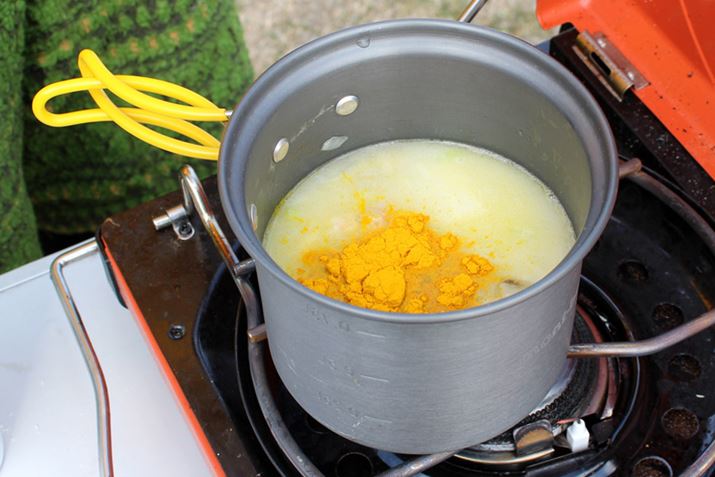 本来はサフランを入れたいところだけど、ちょっと高いのでターメリックで色を付ける。ウコンなので酒との相性もいいはず