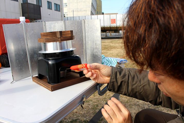 鍋がセットになった小型のガスバーナーを使い、水と酒でカットした野菜などを煮込む