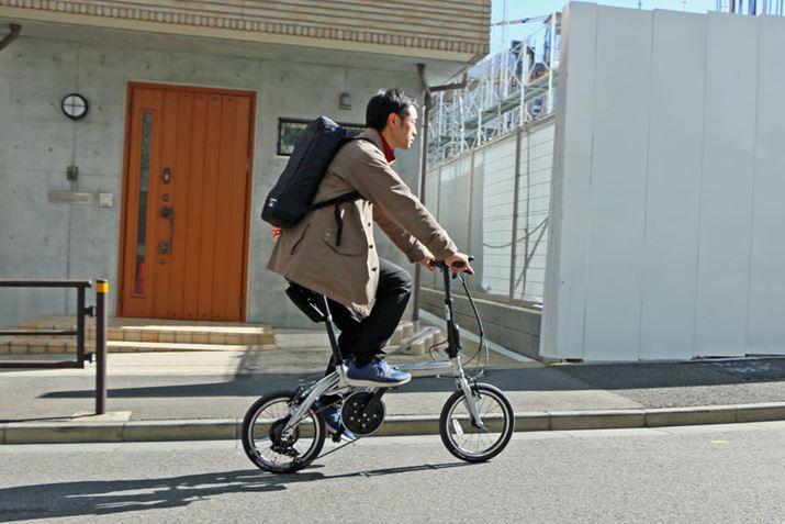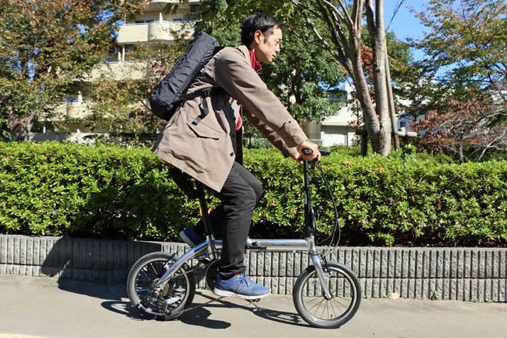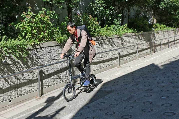 まず、平地を走ってみると、思った以上にスイスイと風を切って進む。ペダルを踏み込んだ瞬間にグイっと進むようなアシスト感ではないが、物足りなさはない。むしろ、シティサイクルタイプの電動アシスト自転車によくあるような、出だしのアシストが強すぎてとまどうようなことがないので、ちょうどいいくらいだ。タイヤの小ささもあり、速いスピードを維持するような走り方は得意ではないが、街中で普通に乗る分には不満はない。
