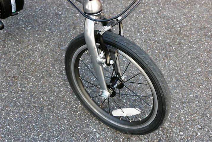 前後のホイールは16インチ。ブレーキはクロスバイクなどに使われるVブレーキを採用しており、ストッピングパワー(ブレーキの効き)も十分