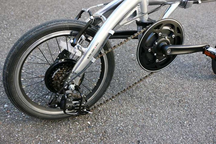 車体の軽さを打ち出したモデルだといっても、走行性能が犠牲にされているわけではない。小径自転車(ミニベロ)は、タイヤの大きな自転車と同じくらいの距離をひと漕ぎで進めるように、一般的な自転車よりも大きなギアをフロント側に装備しているが、ULTRA LIGHT E-BIKE TRANS MOBILLYも同様に、フロント側に大きめのギア(14インチは42T、16インチは48T)を備えており、それほど忙しくペダルを回さなくてもスピードが出せる。また、今回紹介する16インチタイプは、軽さを追求した14インチタイプが発売されたあとに追加された走行性能を重視したモデル。ホイールサイズが大きくなっただけでなく、14インチタイプには装備されていないシマノ製6段変速を備えている。