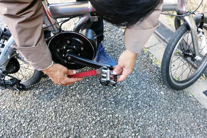輪行バッグに入れる時には、バッテリーとペダルは外しておいたほうがいい。ペダルの着脱には工具が必要だが、工具なしで着脱できる「wellgo クイックリリース脱着ペダル」(4,000円/税別)もオプションで用意されている