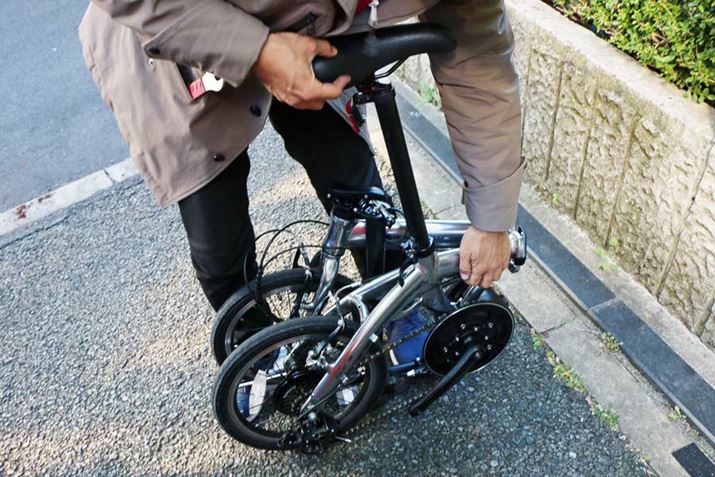 ハンドルやフレームを折りたたむ際には、工具は不要。サドルを下まで下げれば、折りたたみ作業は終了だ