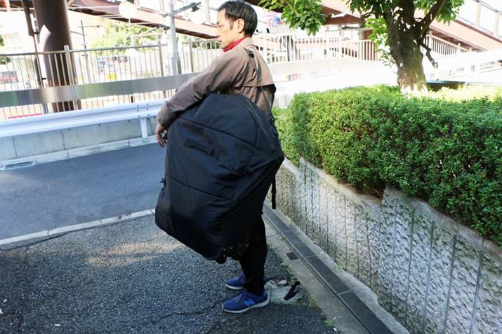 この輪行バッグは製品名にあるように3WAY仕様なので、肩にかけるほか、背負う、転がすと持ち方が選べる。バックパックのように背負ってみると、両肩に重みが分散されるためか、かなりラクに移動できるようになった