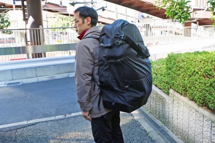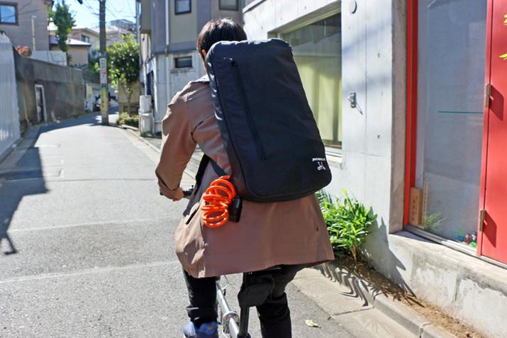 なお、今回使用した「Mobilly キャスター付き3WAYバッグ」は、自転車に乗る際には写真のように折りたたんで背負えるのもいいところ