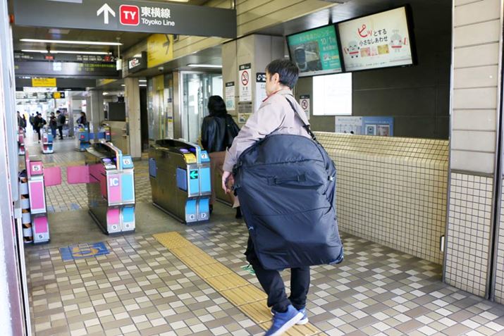 街中での走行性はまったく問題なく、ある程度の坂も登れてしまう走破性を備えたULTRA LIGHT E-BIKE TRANS MOBILLYは、安心して旅先に持って行けそうだ。最後に、そんなシーンを想定し、電車での輪行を体験してみた。なお、電車で輪行するには輪行バッグが必要。今回は、同社の「Mobilly キャスター付き3WAYバッグ」(18,000円/税別)を使用する。