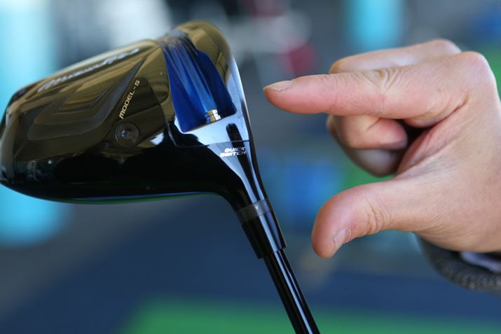 Mizuno Proのドライバーには、弾道調整機能、いわゆるカチャカチャが搭載されています。ロフト角と連動してライ角やフェース角も調整できるようになっていて、ボールのつかまり具合や、打ち出し角の調整が可能です。同社のカチャカチャはスリーブがスリムで、一見すると接着モデルのようなスマートな仕上げになっています。構えたときにネックは意外と目に入る部分ですので、こういった美しい仕上げはうれしいですね。