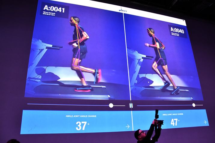 AI技術で解析し、フォーム改善のための適切なトレーニングを提案する計測アプリ「ASICS RUNNING ANALYZER(アシックスランニングアナライザー)」で計測した様子。ランナーは左では「メタライド」を、右では従来モデルを履いている。走行中の足首の屈曲角度が従来モデルは47°だったのに対し、「メタライド」では37°に抑えられているのがわかる