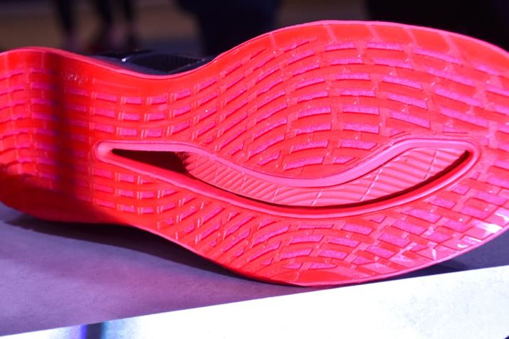 アウトソールにはつま先に向かって上にカーブを描いており、素材も比較的硬いので、身体を前のめりにするだけで足の裏のカーブに沿って、重心が前へ移動し、自然と足が蹴り出せるのだ。