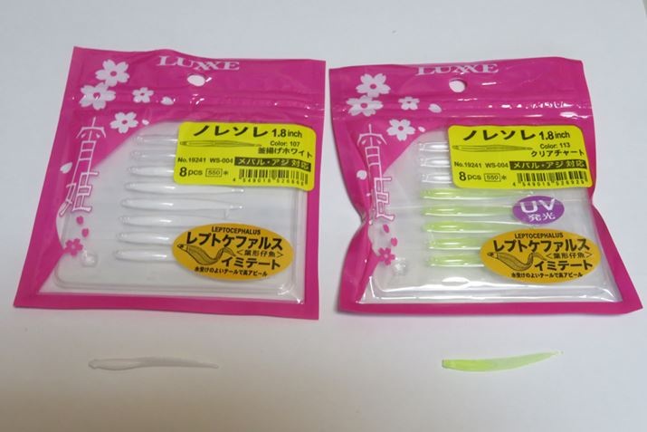 一般的に「ノレソレ」と呼ばれるワーム。ウナギやアナゴの幼生「レプトケファルス」を模した形状で、アジやメバルなどに効果的なアクションを演出する。夜光タイプやUV発光タイプを含めて10色をラインアップする。1袋8本入り