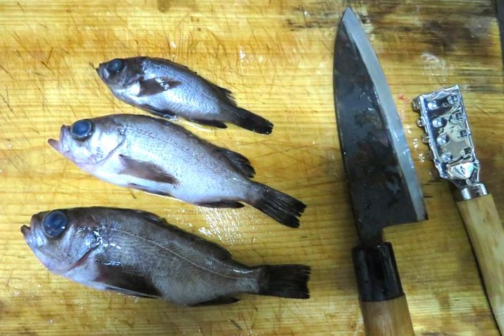さて3匹のメバルは、ウロコと内臓、エラを取ってぬめりがなくなるまで水洗い。その際は、背びれが鋭いので刺さらないように注意。