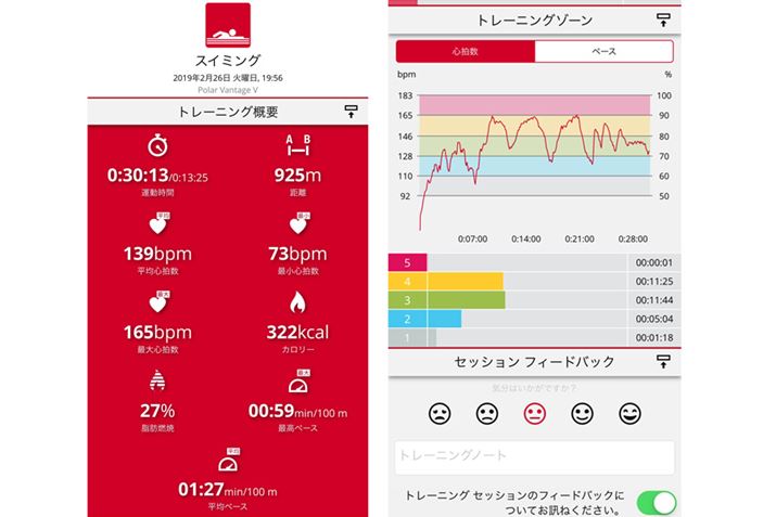 実際に「Polar Vantage V」を着けてクロールで900mほど泳いでみた。スイム中に手首で心拍数を計測できるモデルは現状多くはないため、この体験は新鮮で楽しい。だが、試しに25mだけバタフライを泳いだところ、背泳ぎと判別されていたのが残念。いっぽうで、心拍ゾーンごとのスイム時間をまとめてくれるので、心拍トレーニングには生かせそうだ。