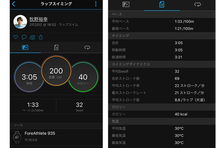 「ForeAthlete 935」では、「Polar Vantage V」では計測できなかったストローク数(本来は右手と左手でかいた数の合計だが、「ForeAthlete 935」では本体を装着した腕でかいた数を計測)を計測できるのが便利。また、「泳いだ時間」+「ストローク数」の合計で算出される「SWOLF」も自動で計算される。この数値を下げれば下げるほど効率性が上がっていくので、楽に速く泳ぐための目安になるわけだ。この機能は、スイムトレーニングにもってこいと言えよう。